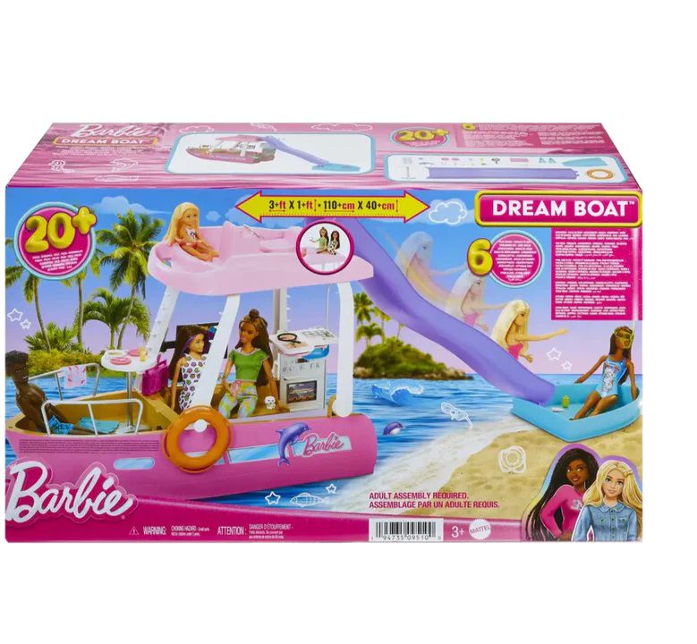 Experimente um verdadeiro sonho tornado realidade com o Barbie Dreamboat! Com este barco incrível você navegará pelos sete mares com estilo. Quer você esteja rumo a águas mais calmas ou a uma aventura de espadachim, este barco está equipado para levá-lo até lá, fazendo ondas por onde quer que você vá! Além disso, com 91 cm de largura e 30 cm de altura, há muito espaço para a Barbie convidar seus amigos e se divertir ao sol! Bonecas não incluídas. As cores e as decorações podem variar.