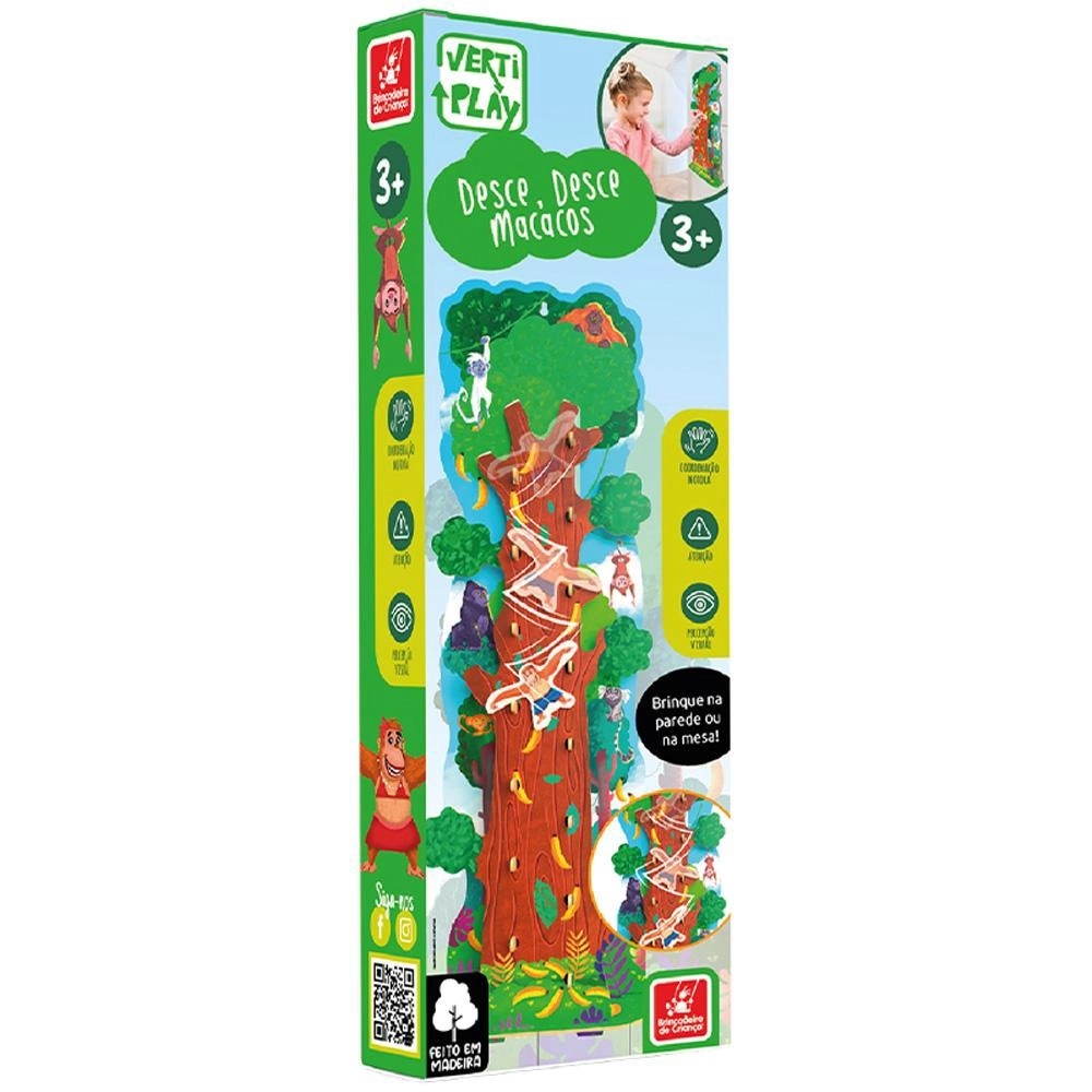 As bananas caíram, ajude o macaco a recuperá-las. O Desce, desce – Macacos é um divertido brinquedo de movimento cadenciado, no qual o macaco é colocado no topo da árvore e vai descendo em movimentos de zigue-zague. Esse brinquedo pode ser utilizado tanto em cima de uma superfície dura e nivelada, quanto na parede. Auxilia no desenvolvimento da coordenação motora, da percepção visual e da atenção.