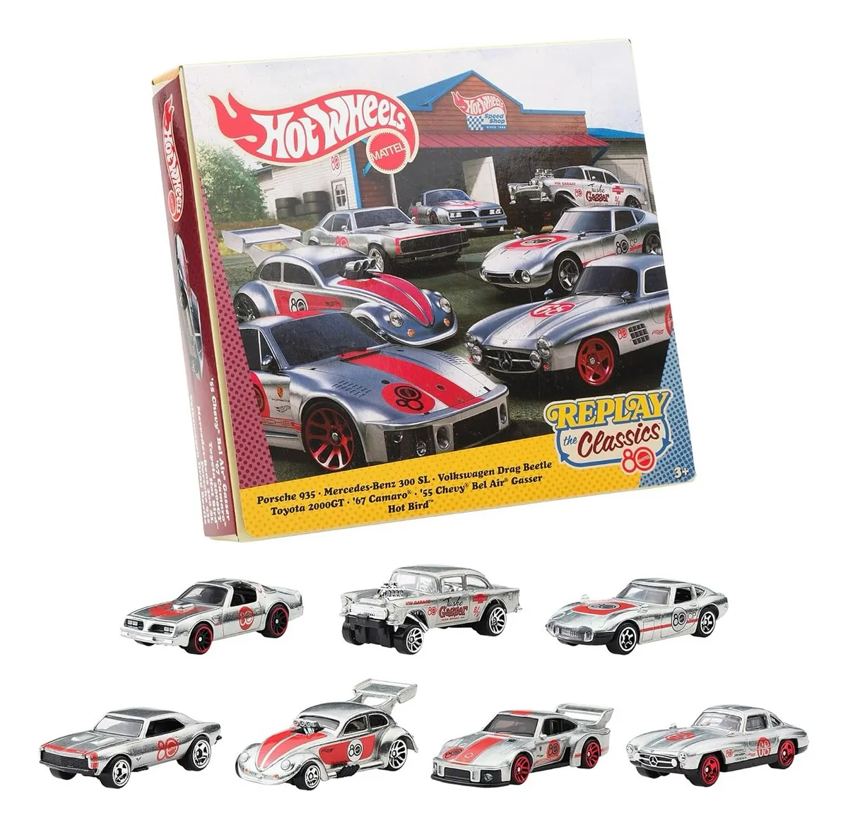 Descubra a colecao Hot Wheels Replay The Classics, uma homenagem aos 80 anos de paixao por carros em miniatura. Este conjunto exclusivo, composto por 7 veículos em escala 1:64, é ideal para colecionadores e entusiastas de todas as idades. Cada modelo é meticulosamente fabricado em metal, garantindo durabilidade e um acabamento impecável.