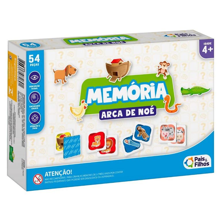 Jogo da memória Arca de Noé, este jogo estimula a memória dos participantes, que por sua vez, tentam encontrar figuras idênticas, formando o par. Ganha aquele que conseguir o maior número de pares de figuras. Contém 40 peças ilustradas. Faixa etária:ianças a partir dos 4 anos.