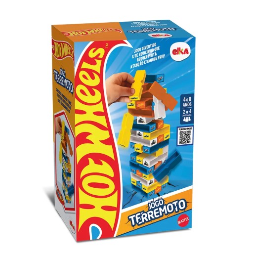 Terremoto é um jogo de equilíbrio que exige muita atenção e sangue frio! Construa a torre com os carros de Hot Wheels e, ao girar a roleta, sorteie a cor do bloco. Retire-o com cuidado e coloque-o no topo da torre, mas atenção: não deixe que a torre caia, senão o terremoto acontece e você perde o jogo! Esse jogo desenvolve a concetração, coordenação motora e equilíbrio nas crianças.